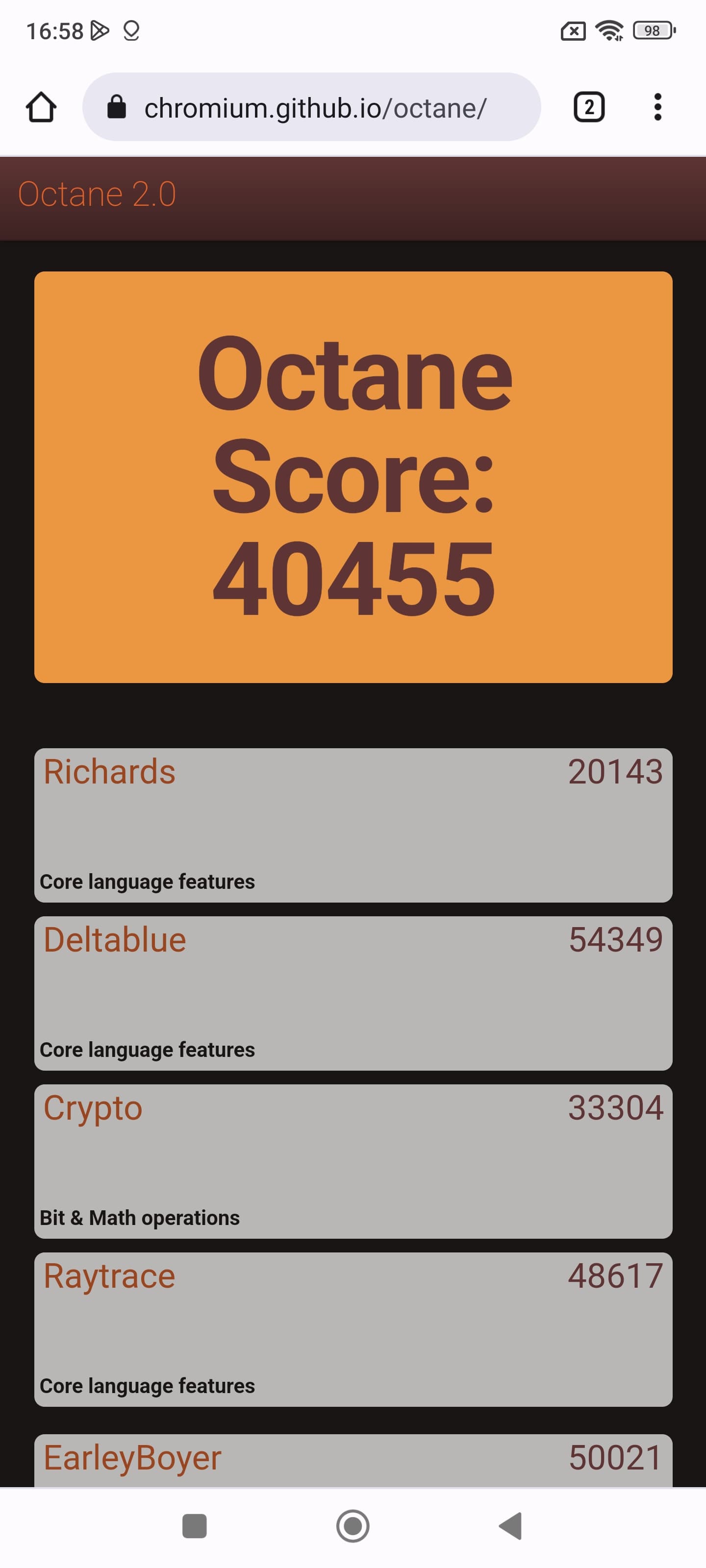 | Google Octane 2 (больше — лучше) | 40455 | 25629 | 30849 | 36245 | 54735 |