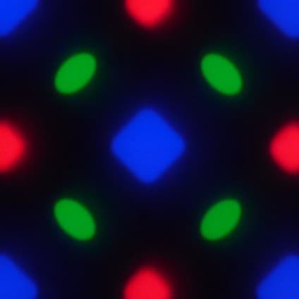 В этом экране используется матрица Super AMOLED — активная матрица на органических светодиодах. Полноцветное изображение создается с помощью субпикселей трех цветов — красного (R), зеленого (G) и синего (B), но красных и синих субпикселей в два раза меньше, что можно обозначить как RGBG. Это подтверждается фрагментом микрофотографии: