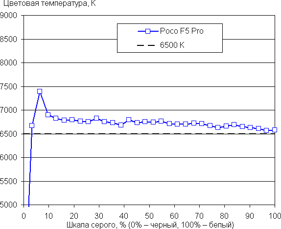 Напомним, что в случае OLED-экранов яркость фрагментов изображения динамично меняется в соответствии с характером выводимого изображения — немного уменьшается для светлых в целом изображений. В итоге полученная зависимость яркости от оттенка (гамма-кривая), скорее всего, не соответствует гамма-кривой статичного изображения, так как измерения проводились при последовательном выводе оттенков серого почти на весь экран.