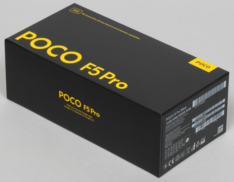 Poco F5 Pro поставляется в твердой картонной коробке со стильным лаконичным оформлением.