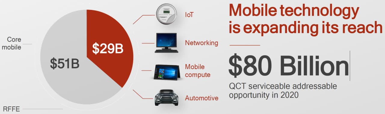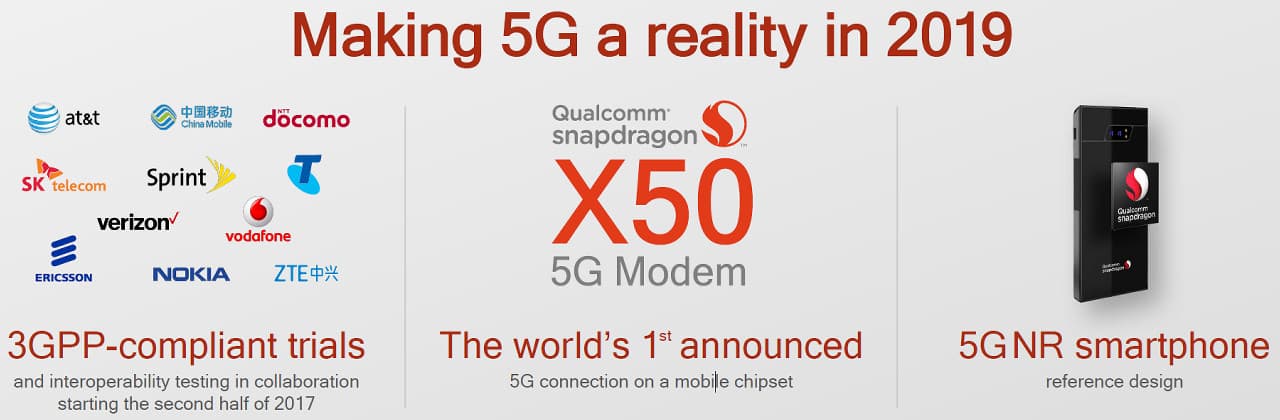 Неудивительно, что громадный объем рынка в 80 миллиардов долларов, прогнозируемых в 2020 году, из которых 51 млрд занимают мобильные устройства, а оставшиеся 29 млрд — автомобили, интернет вещей и т. п., является лакомым куском для любой компании, включая Qualcomm. Тем более что они являются одним из лидеров рынка сейчас и явно не собираются упускать имеющуюся долю, а хотят нарастить ее. Следующий большой шаг, который способен им серьезно помочь в этом — распространение мобильных сетей пятого поколения, в разработке технологий которых компания является одним из лидеров. Компания первой анонсировала 5G-модем Qualcomm Snapdragon X50, а готовые устройства на его основе ожидаются уже в 2019 году.