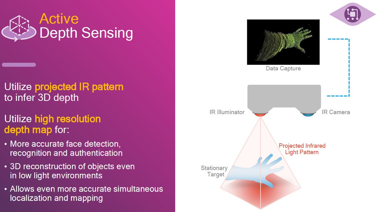 Сигнальный процессор Spectra ISP второго поколения поддерживает два метода измерения глубины: пассивный и активный. Первый метод позволяет использовать две камеры, расположенные рядом, а для более сложных применений в системах расширенной реальности Spectra 280 ISP способен обрабатывать информацию от активных сенсоров глубины, использующих инфракрасное освещение и ИК-датчик для того, чтобы строить карты глубин высокого разрешения.