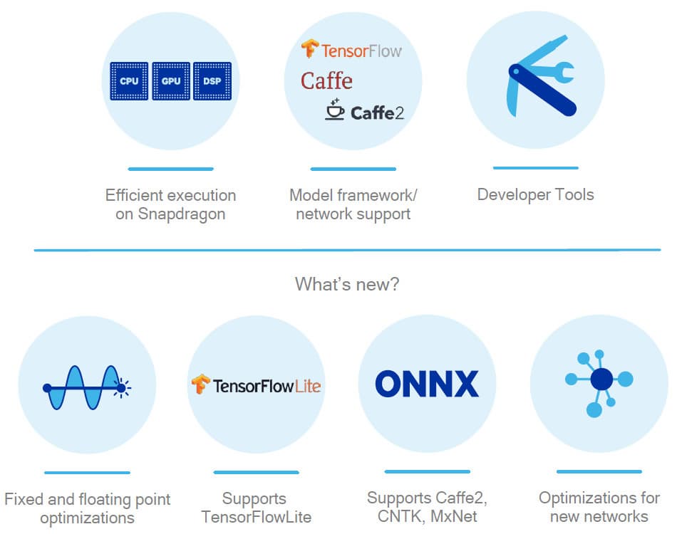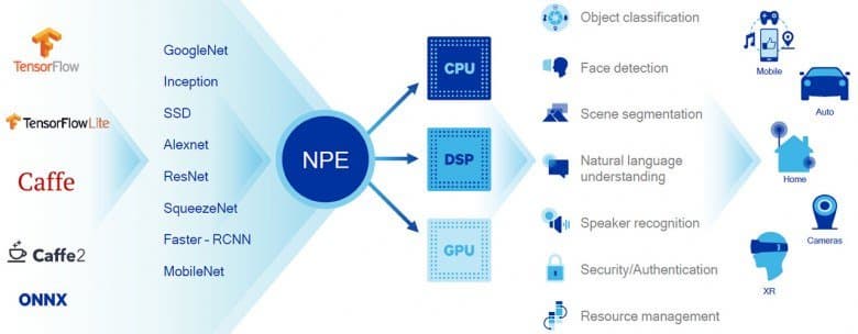 Компания Qualcomm предлагает такие возможности, и их Neural Processing Engine поддерживается всеми распространенными фреймворками машинного обучения: Google TensorFlow (это первая мобильная платформа с такой поддержкой), FaceBook Caffe2 и другими. Поддержка специализированных фреймворков обеспечивает эффективные вычисления на различных типах ядер — CPU, GPU или DSP.
