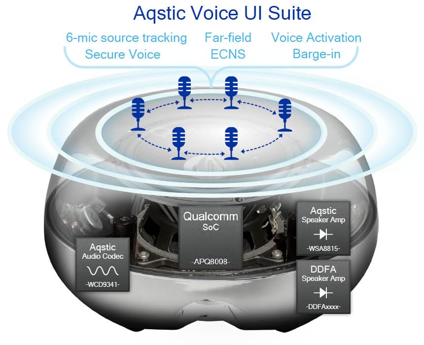 Компания Qualcomm даже представила референсный дизайн подобного устройства, использующий массив из шести микрофонов, с технологиями отсеивания эха и устойчивой работой распознавания голоса в шумных помещениях, отслеживанием говорящего человека, постоянной прослушкой эфира с распознаванием ключевого пробуждающего слова («OK Google») с низким энергопотреблением. Это решение позволит сторонним производителям в кратчайшие сроки создать собственные аналогичные устройства, использующие программные и аппаратные технологии Qualcomm.