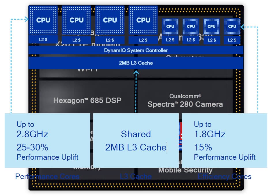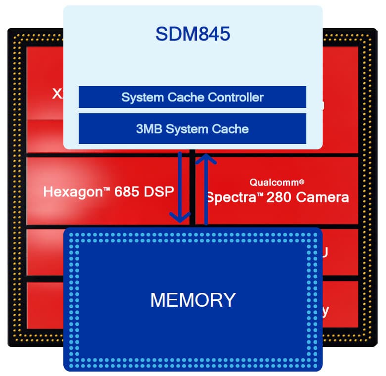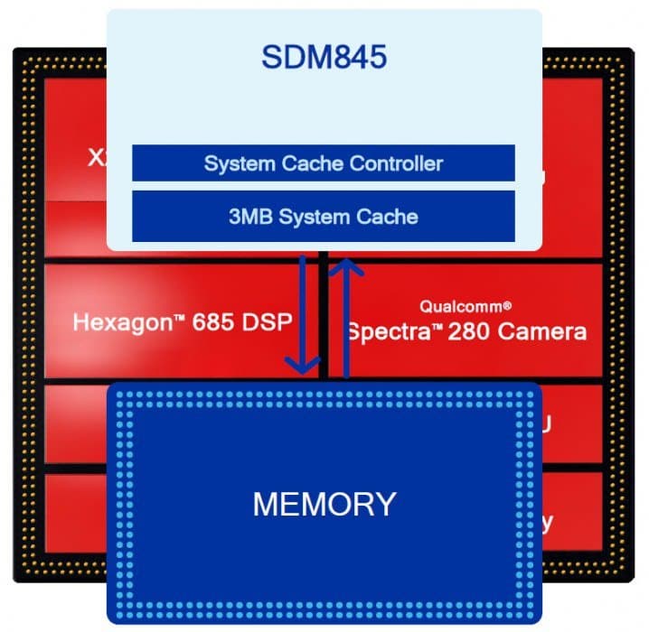Часть 30%-ного увеличения производительности и аналогичного улучшения энергоэффективности в Snapdragon 845 достигается при помощи большого объема системной кэш-памяти для ядер Kryo в дополнение к выделенной памяти, обслуживающей все основные блоки процессора, так что и блоки типа DSP и модема также могут осуществлять быстрый доступ к данным, минуя основную память. В росте производительности виновата и добавленная кэш-память, и возросшая частота работы CPU-ядер, и в целом бо́льшая эффективность ядер Cortex-A75/A55 по сравнению с A73/A53.