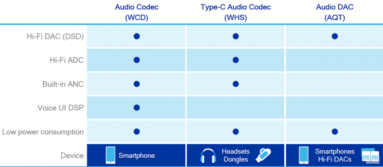 Также компания Qualcomm предлагает несколько кодеков, предназначенных для внедрения сторонними производителями в их устройства. К примеру, это кодек Aqstic под наименованием WHS9420, специально созданный для передачи очень качественного звука на наушники и динамики по USB-соединению с разъемом USB Type-C. Чип отличается низким энергопотреблением, встроенным ЦАП уровня Hi-Fi с динамическим диапазоном более 120 дБ и уровнем нелинейных искажений ниже −100 дБ. Им поддерживается передача звука в формате до 384 кГц/32 бит, а также активная система шумоподавления.