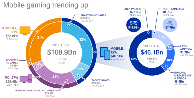 Да и мобильная игровая графика требует от графических процессоров все большей мощности, стремительно развиваясь. Согласно глобальному отчету Newzoo о состоянии игровой индустрии, в 2017 году рынок игр на мобильных устройствах занимает долю 42% из общих 108,9 млрд долларов. Консольные игры занимают менее трети рынка, ПК-игры — чуть меньше, а исключительно смартфонные развлечения — 32%, то есть даже больше тех и других. Если добавить 10% от планшетов, то будет совсем хорошо.