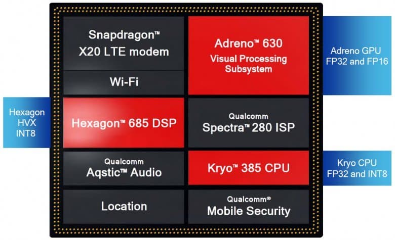 Snapdragon 845 способен облегчить жизнь пользователей, добавляя элементы ИИ в такие задачи, как умные персональные помощники, улучшение качества фото- и видео и т. д. Разработчики программного обеспечения могут выбрать наиболее подходящие вычислительные ядра для своих приложений: универсальные вычислительные CPU-ядра Kryo 385, достаточно быстро производящие расчеты в целочисленном 8-битном формате и формате с плавающей запятой FP32, ядра графического процессора Adreno 630, умеющие быстро выполнять грамотно распараллеленные алгоритмы в форматах с плавающей запятой с 16- и 32-битной точностью FP16 и FP32, а также выделенное DSP-ядро Hexagon 685, которое специализируется на высокопроизводительных векторных вычислениях HVX и целочисленном формате INT8.