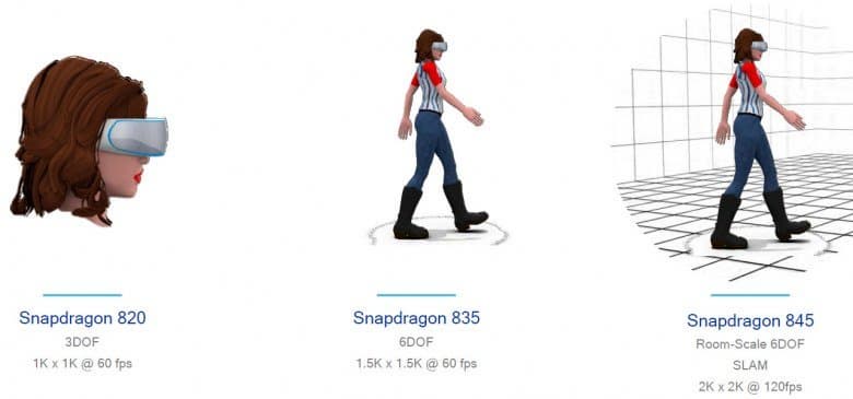 Предыдущий чип Snapdragon 835 также отслеживал действия в шести степенях свободы, но теперь пользователь может свободно передвигаться по комнате и отслеживаться в виртуальном окружении с определением столкновений со стенами и другими реальными объектами. Snapdragon 845 — это первый мобильный процессор с подобными возможностями.