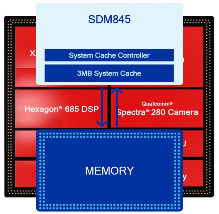 Хотя это относится не только к CPU и не является его частью, совершенно новым для Snapdragon 845 стало включение в состав мобильного процессора системной кэш-памяти объемом в 3 МБ, служащей для обеспечения обмена данными между различными исполнительными ядрами — аналогично L3-кэшу в однокристальных системах Apple, что впервые встречается в решениях Qualcomm.