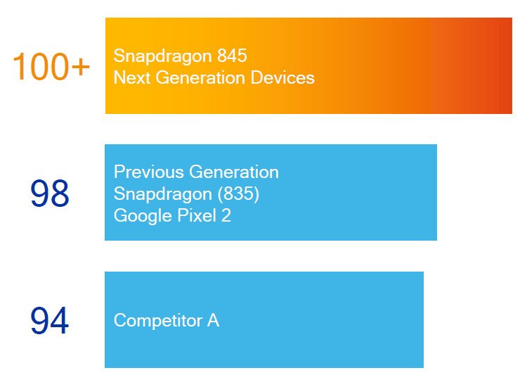 Компания Qualcomm уверена в том, что возможности Snapdragon 845 обеспечат топовым смартфонам 2018 года такое качество фото- и видеосъемки, которое соответствует более чем 100 баллам по известной оценке DxOMark. В принципе, это вполне достижимо, так как смартфон Google Pixel 2 на основе Snapdragon 835 уже набирает в бенчмарке DxOMark 98 баллов.
