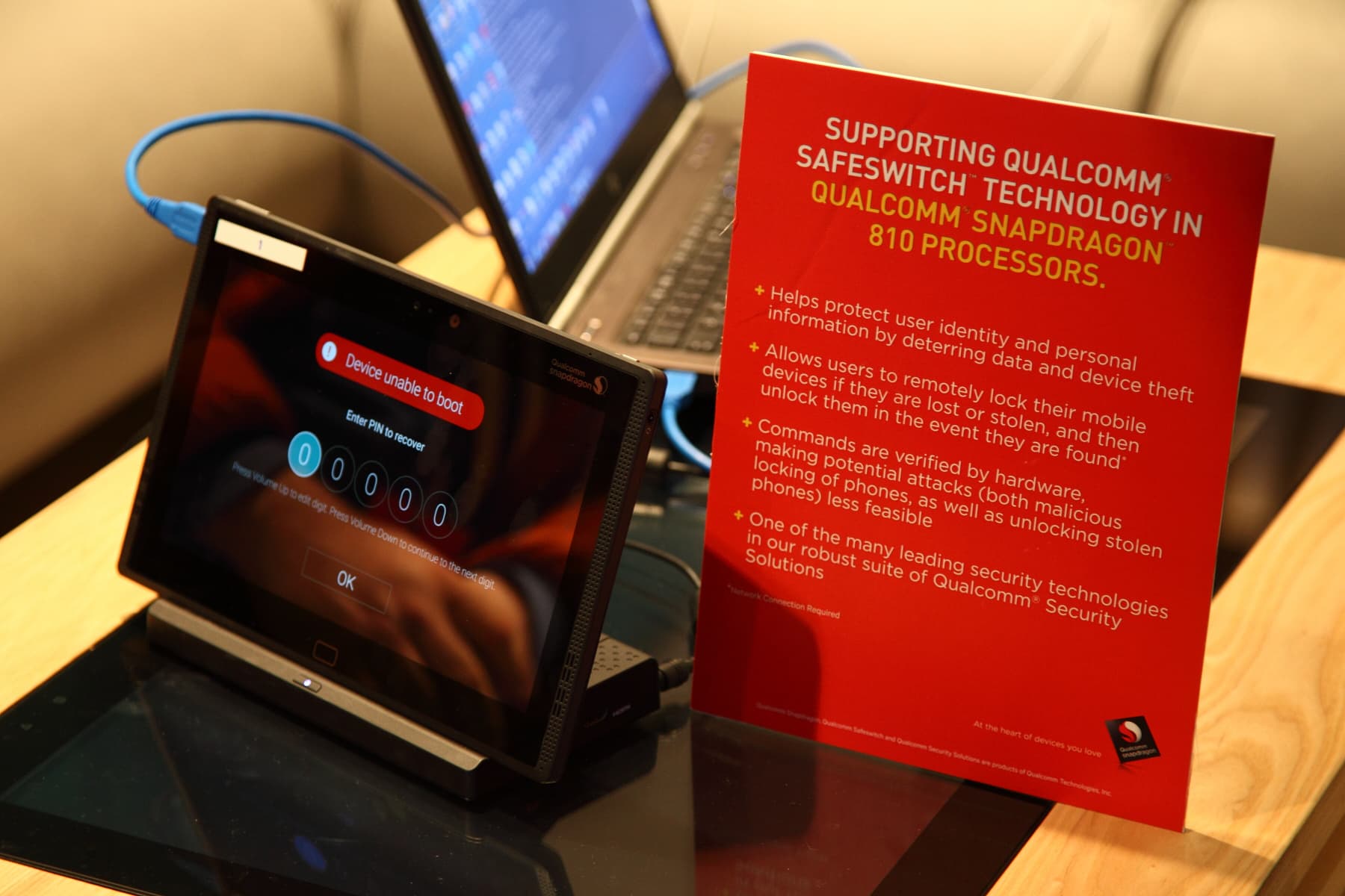 Из более серьезных технологий Qualcomm показывала SafeSwitch — технологию удаленной блокировки украденных устройств, реализованную на аппаратном уровне прямо в однокристальной системе. Это аппаратное средство для защиты персонального устройства (смартфоны, планшеты и т. п.) от несанкционированного доступа, помогающее защитить личные данные при похищении устройства, также оно помогает истинному пользователю удаленно заблокировать и разблокировать устройство.