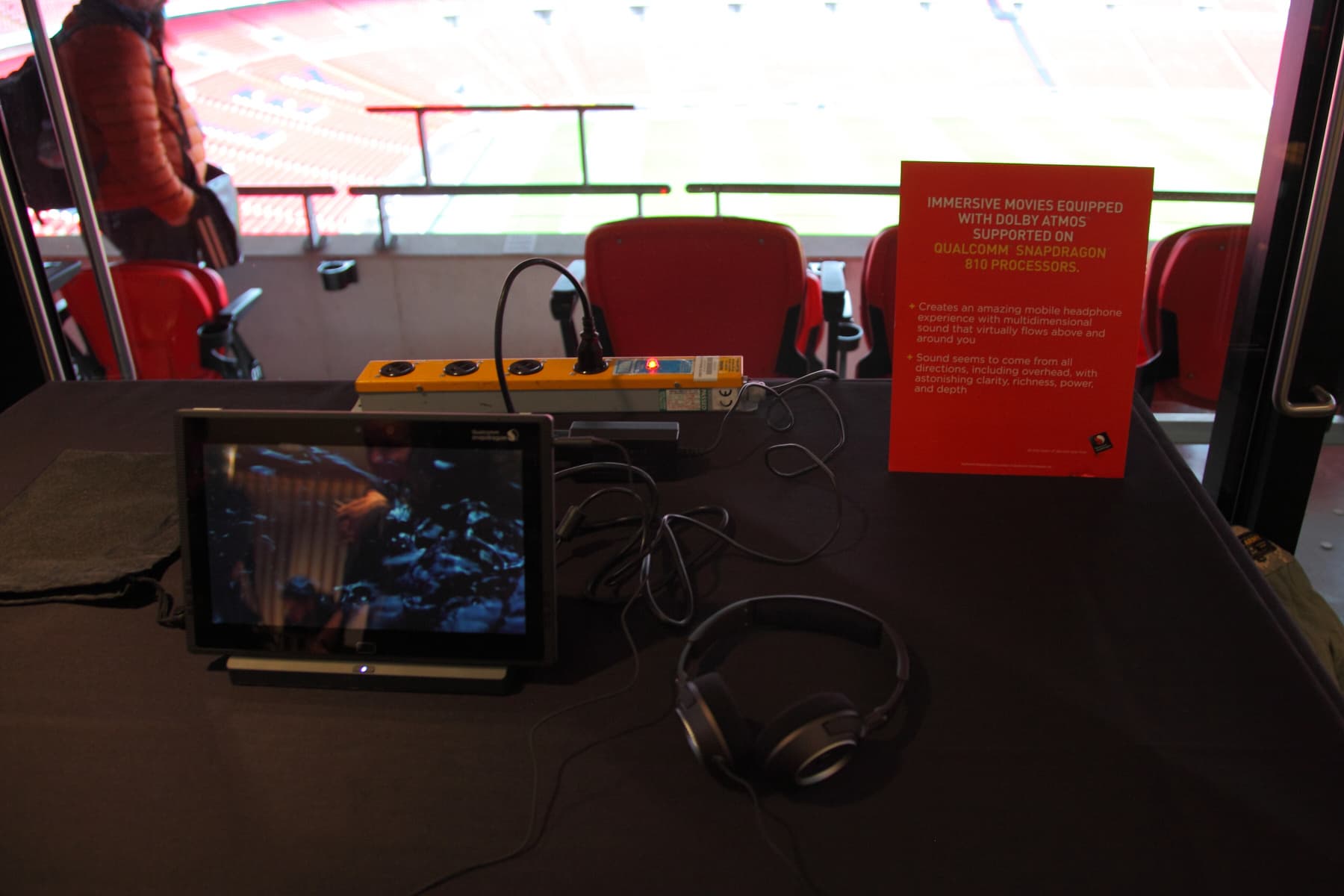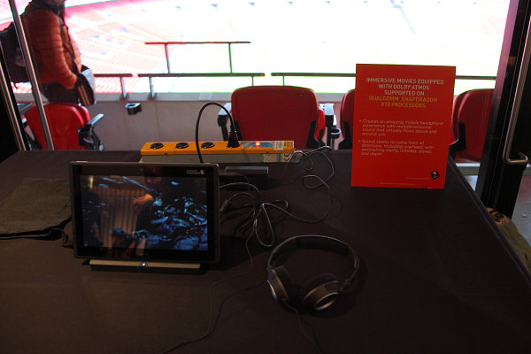 Еще одной представленной журналистам демонстрацией, относящейся уже к звуку, стал стенд с референсным планшетом Qualcomm и наушниками — он показывал возможности технологии Dolby Atmos для улучшения звука в наушниках мобильных устройств.