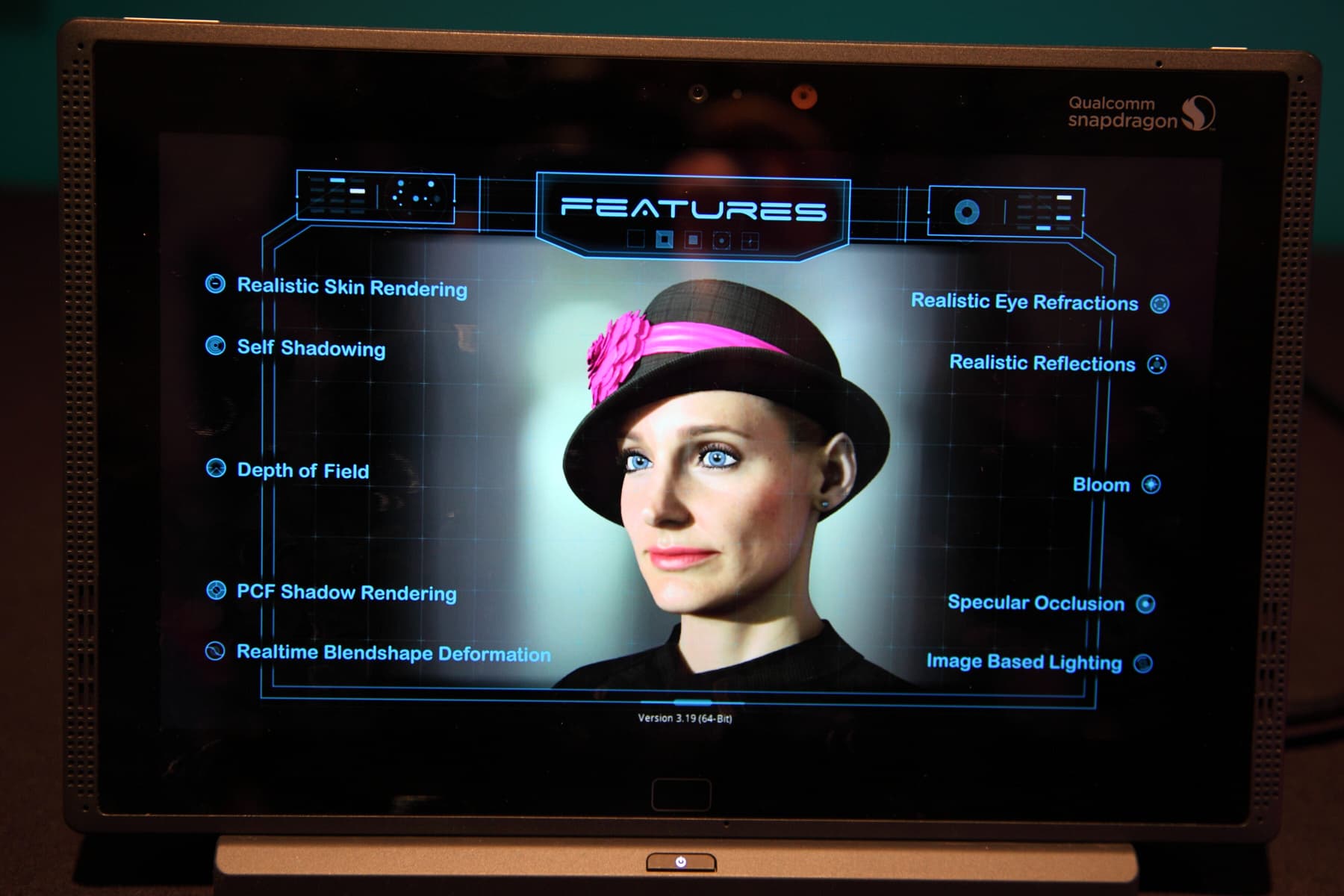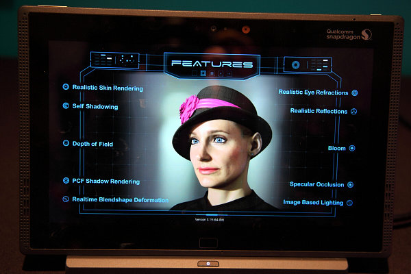 Переходим к демонстрации возможностей 3D-рендеринга на графических ядрах Adreno компании Qualcomm. Компания гордится тем, что их GPU поддерживают почти всю современную 3D-функциональность, которая ранее была доступна только на больших ПК. Например, последние поколения Adreno, вроде модели 430, поддерживают аппаратную тесселяцию геометрии, известную нам по настольным GPU. Для демонстрации тесселяции Qualcomm показали несколько демок, в том числе — отрендеренную в реальном времени женскую голову: