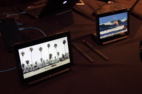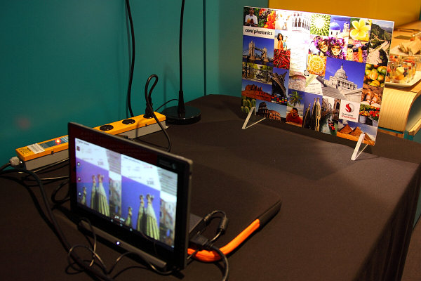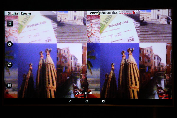 Образец аппаратного обеспечения, показанный на стенде, оснащен парой камер (скорее, сдвоенной камерой), одна из которых имеет привычный широкоугольный объектив, а другая — объектив с большим фокусным расстоянием. Такая система из двух камер может использовать данные, получаемые одновременно с двух датчиков для создания одной фотографии, предоставляя дополнительные возможности при обработке.