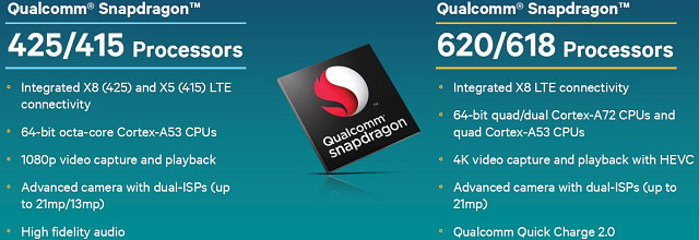 Следующее поколение Qualcomm Snapdragon серий 600 и 400 приносит в массовый сегмент смартфонов функциональность и производительность недавних топовых решений. Так, Snapdragon 425 и 415 основаны на восьми 64-битных ядрах Cortex-A53 и видеоядре Adreno 405, включают встроенную поддержку X5 LTE категории 4 для Snapdragon 415 и X8 LTE категории 7 для модели 425, поддерживают высококачественный звук и продвинутые возможности камеры с поддержкой двух ISP (до 21+13 мегапикселей) и кодированием и декодированием видеоданных в формате FullHD.