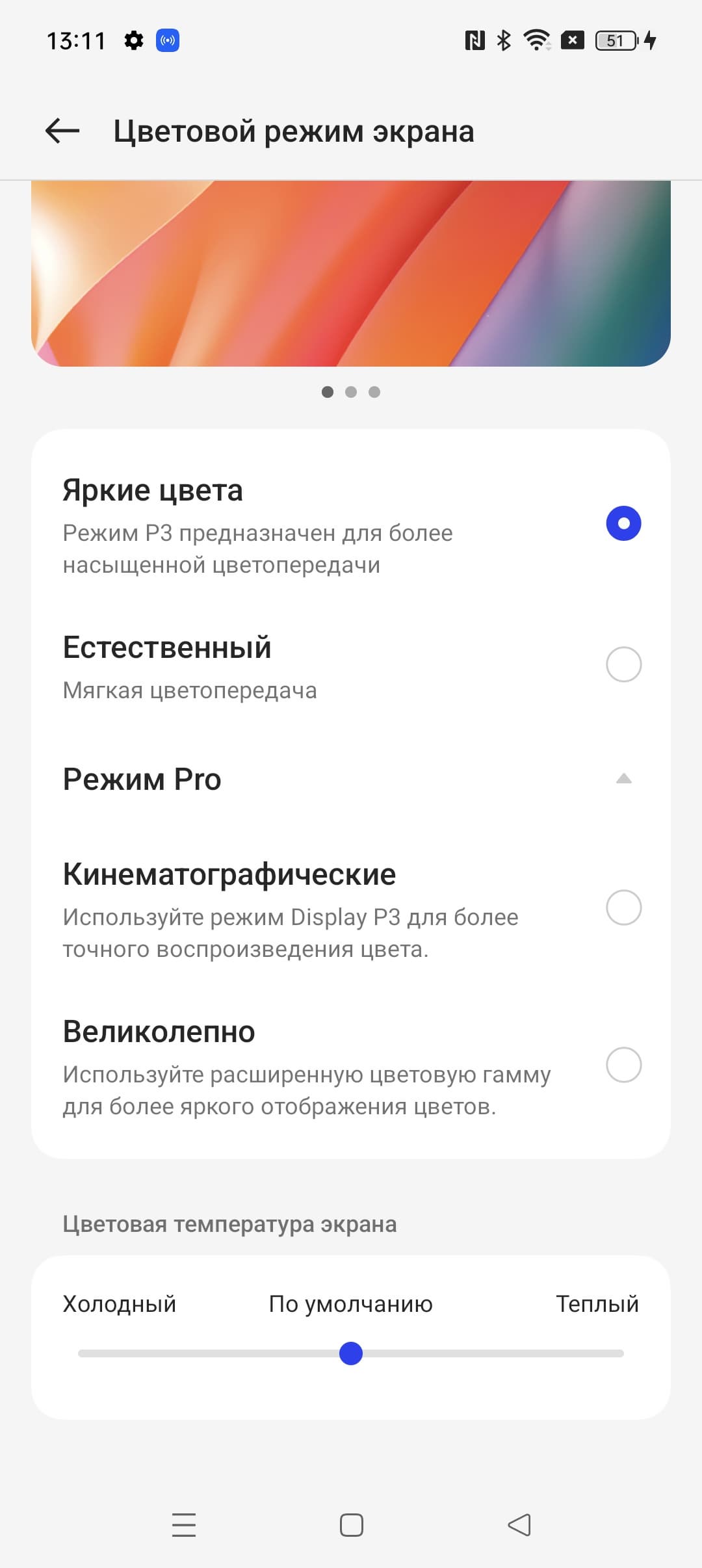 Фотография выше получена для профиля Яркие цвета в настройках экрана, который выбран по умолчанию. Профилей всего четыре: