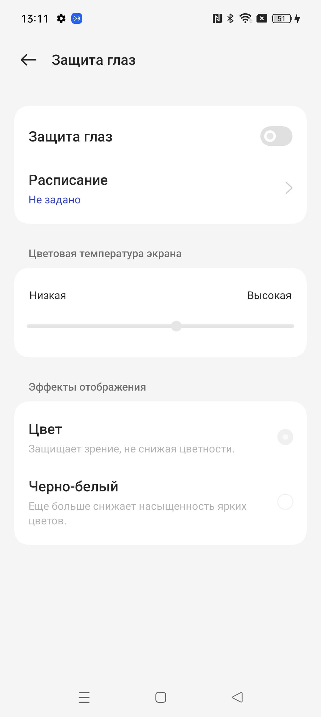В этом устройстве есть возможность скорректировать цветовой баланс с помощью регулировки оттенка холодный—теплый. Но особого смысла делать это нет, достаточно выбрать профиль Естественный. Также в настройках можно уменьшить интенсивность синей компоненты.
