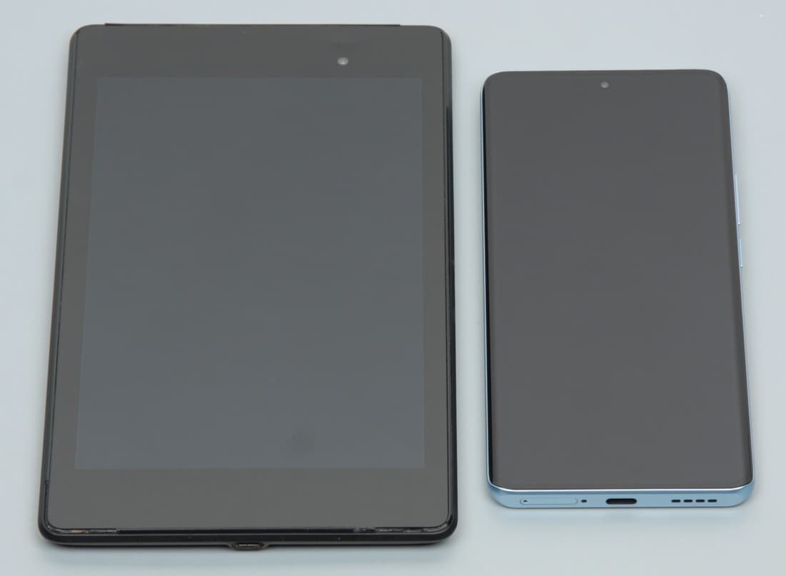 Лицевая поверхность экрана выполнена в виде стеклянной пластины с зеркально-гладкой поверхностью, устойчивой к появлению царапин. Судя по отражению объектов, антибликовые свойства экрана не хуже, чем у экрана Google Nexus 7 (2013) (далее просто Nexus 7). Для наглядности приведем фотографию, на которой в выключенных экранах отражается белая поверхность (слева — Nexus 7, справа — Realme 10 Pro+ 5G, далее их можно различать по размеру):