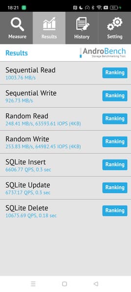 Результаты теста AndroBench на скорость работы с памятью: