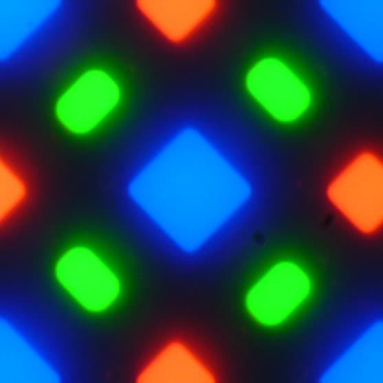 В этом экране используется матрица Super AMOLED — активная матрица на органических светодиодах. Полноцветное изображение создается с помощью субпикселей трех цветов — красного (R), зеленого (G) и синего (B), но красных и синих субпикселей в два раза меньше, что можно обозначить как RGBG. Это подтверждается фрагментом микрофотографии: