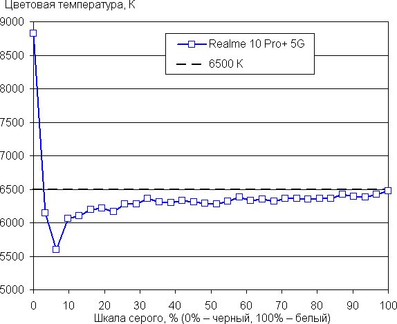 (Самые темные области шкалы серого в большинстве случаев можно не учитывать, так как там баланс цветов не имеет большого значения, да и погрешность измерений цветовых характеристик на низкой яркости высокая.)
