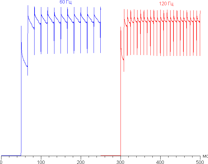 Переключение состояния элементов матрицы выполняется практически мгновенно, но на фронте включения может присутствовать ступенька шириной примерно 17 мс (что соответствует частоте обновления экрана примерно в 60 Гц) или примерно 8 мс (120 Гц). Например, так выглядит зависимость яркости от времени при переходе от черного к белому (режим 60 Гц и 120 Гц):