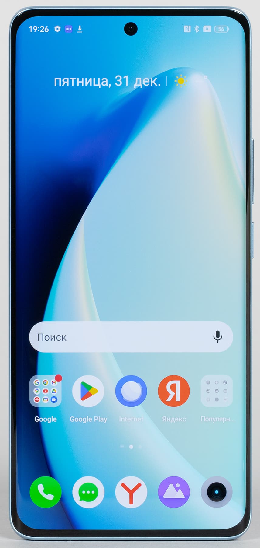 Цвета на экране Realme 10 Pro+ 5G перенасыщены (обратите внимание на помидоры, бананы, салфетку и оттенок лица), а цветовой баланс заметно отличается. Напомним, что фотография не может служить надежным источником сведений о качестве цветопередачи и приводится только для условной наглядной иллюстрации. В частности, выраженный красноватый оттенок белого и серого полей, присутствующий на фотографиях экрана Realme 10 Pro+ 5G, при перпендикулярном взгляде визуально отсутствует, что подтверждается аппаратными тестами с помощью спектрофотометра. Причина в том, что спектральная чувствительность матрицы фотоаппарата неточно совпадает с этой характеристикой человеческого зрения. Заметим, что в данном случае картинка занимает в высоту (при ландшафтной ориентации экрана) всю доступную для вывода изображения область и заходит на загнутые края экрана, что приводит к легкому затемнению и искажению цвета. Также на свету эти области почти всегда бликуют, что еще больше мешает при просмотре изображений, выведенных на весь экран. И даже картинка фильмов с соотношением сторон 16:9 заходит на загибы, что мешает при просмотре кино.