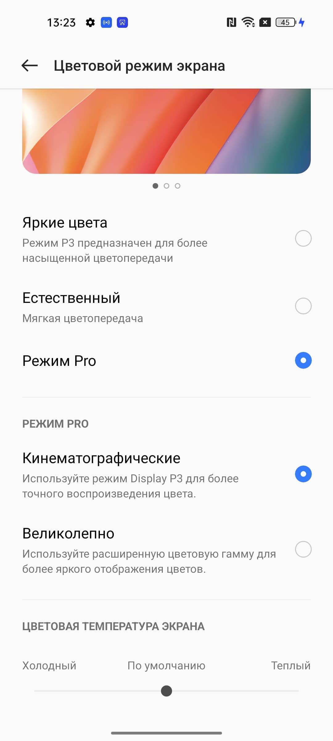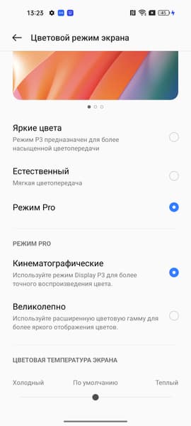 Фотография выше получена для профиля Яркие цвета в настройках экрана, который выбран по умолчанию. Профилей всего четыре: