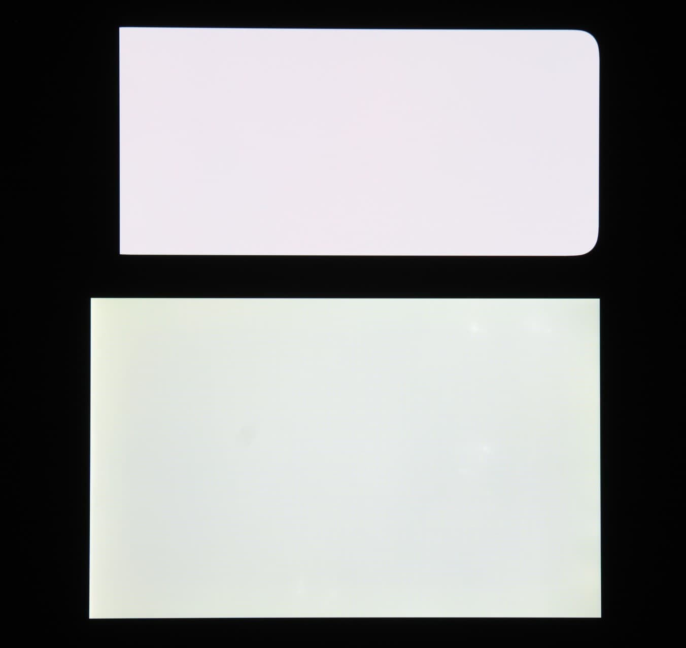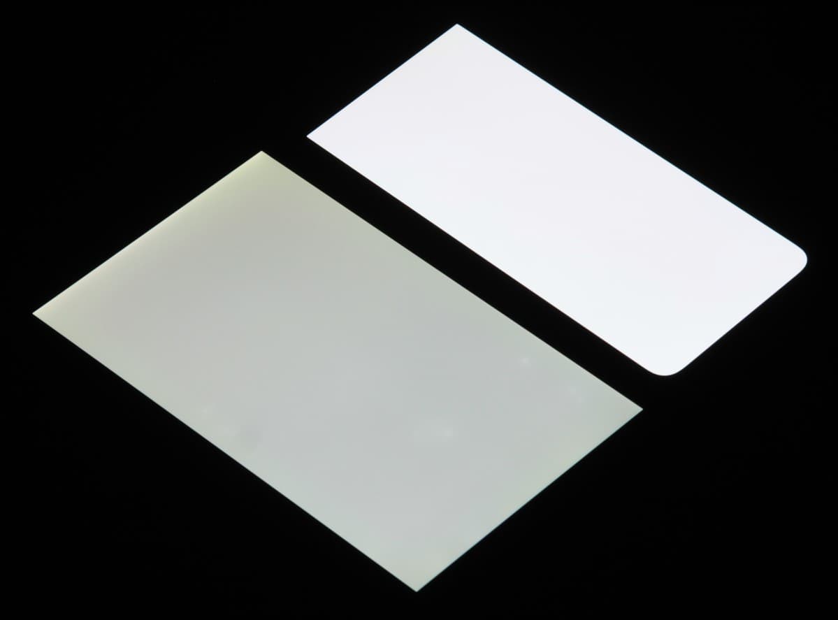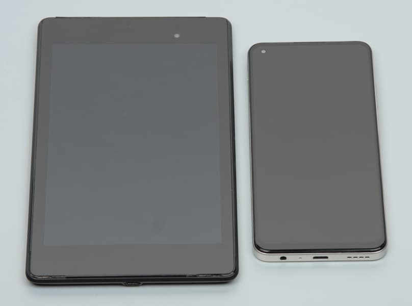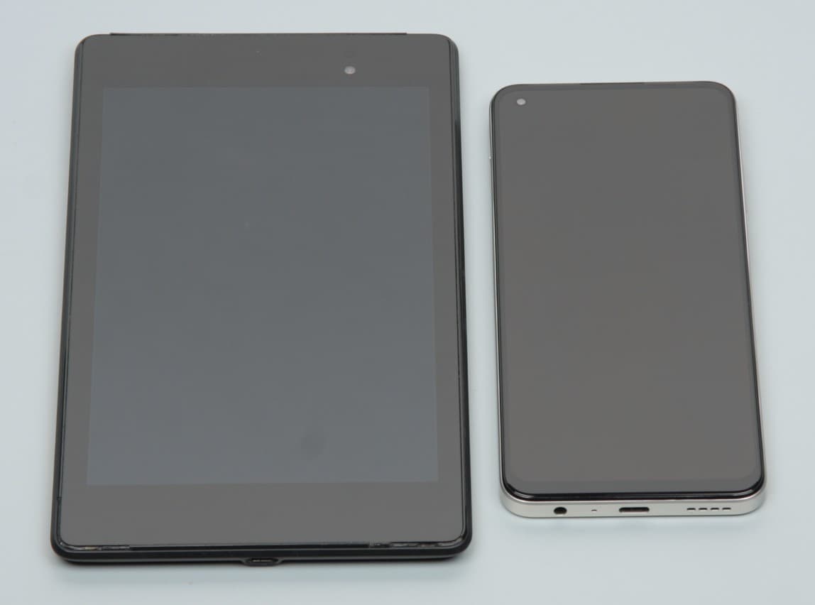 Лицевая поверхность экрана выполнена в виде стеклянной пластины с зеркально-гладкой поверхностью, устойчивой к появлению царапин. Судя по отражению объектов, антибликовые свойства экрана не хуже, чем у экрана Google Nexus 7 (2013) (далее просто Nexus 7). Для наглядности приведем фотографию, на которой в выключенных экранах отражается белая поверхность (слева — Nexus 7, справа — Realme 10, далее их можно различать по размеру):