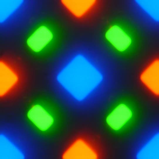 В этом экране используется матрица Super AMOLED — активная матрица на органических светодиодах. Полноцветное изображение создается с помощью субпикселей трех цветов — красного (R), зеленого (G) и синего (B), но красных и синих субпикселей в два раза меньше, что можно обозначить как RGBG. Это подтверждается фрагментом микрофотографии: