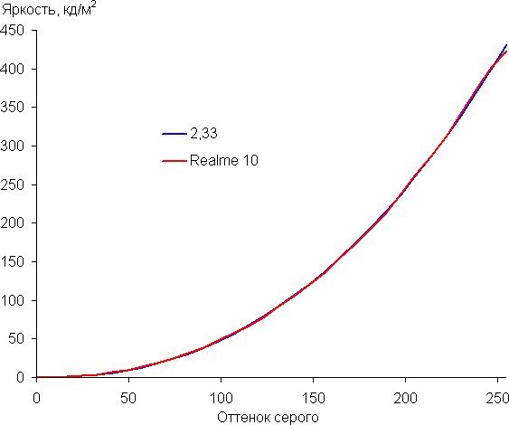Напомним, что в случае OLED-экранов яркость фрагментов изображения динамично меняется в соответствии с характером выводимого изображения — немного уменьшается для светлых в целом изображений. В итоге полученная зависимость яркости от оттенка (гамма-кривая), скорее всего, не точно соответствует гамма-кривой статичного изображения, так как измерения проводились при последовательном выводе оттенков серого почти на весь экран.