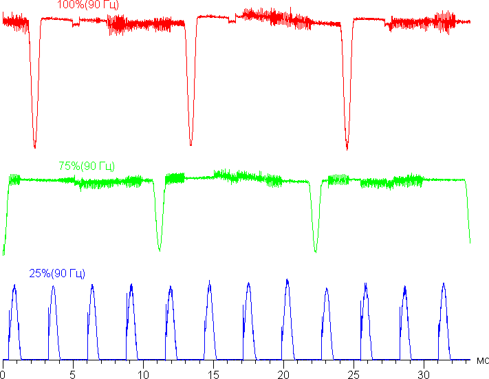Частота модуляции на высокой яркости увеличилась до 90 Гц, а на средней и низкой характер модуляции такой же, что и в случае частоты обновления 60 Гц — мерцание можно обнаружить.