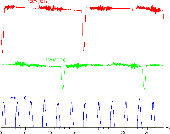 На любом уровне яркости присутствует значимая модуляция с частотой 60, 90 или 360 Гц. На рисунке ниже приведены зависимости яркости (вертикальная ось) от времени (горизонтальная ось) для нескольких значений настройки яркости. Сначала для режима с частотой обновления 60 Гц: