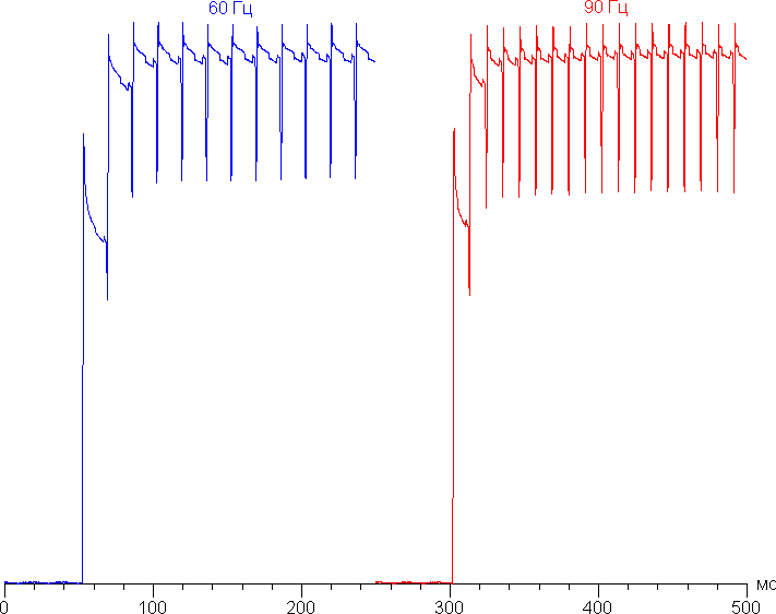 Переключение состояния элементов матрицы выполняется практически мгновенно, но на фронте включения может присутствовать ступенька шириной примерно 17 мс (что соответствует частоте обновления экрана примерно в 60 Гц) или примерно 11 мс (90 Гц). Например, так выглядит зависимость яркости от времени при переходе от черного к белому (режим 60 Гц и 90 Гц):