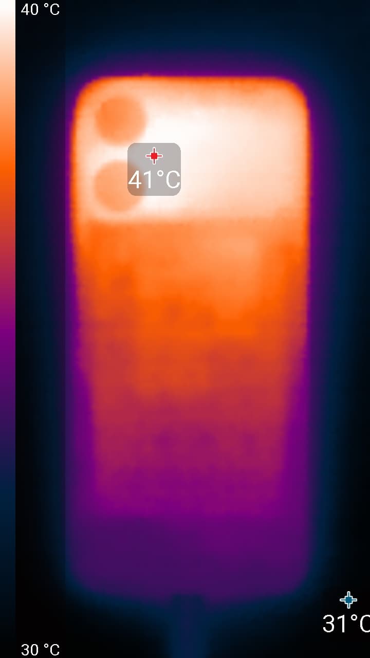 Нагрев больше в верхней части аппарата, что, видимо, соответствует расположению микросхемы SoC. По данным теплокамеры, максимальный нагрев составил 41 градус (при температуре окружающего воздуха в 24 градуса), это средний нагрев в данном тесте для современных смартфонов.