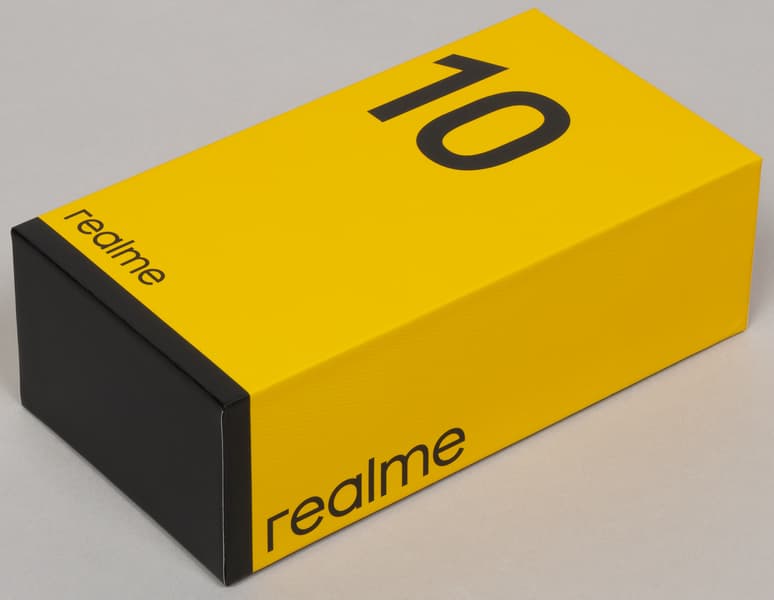 Realme 10 поставляется в твердой картонной упаковке с привычным и довольно лаконичным оформлением в желто-черных фирменных цветах бренда.