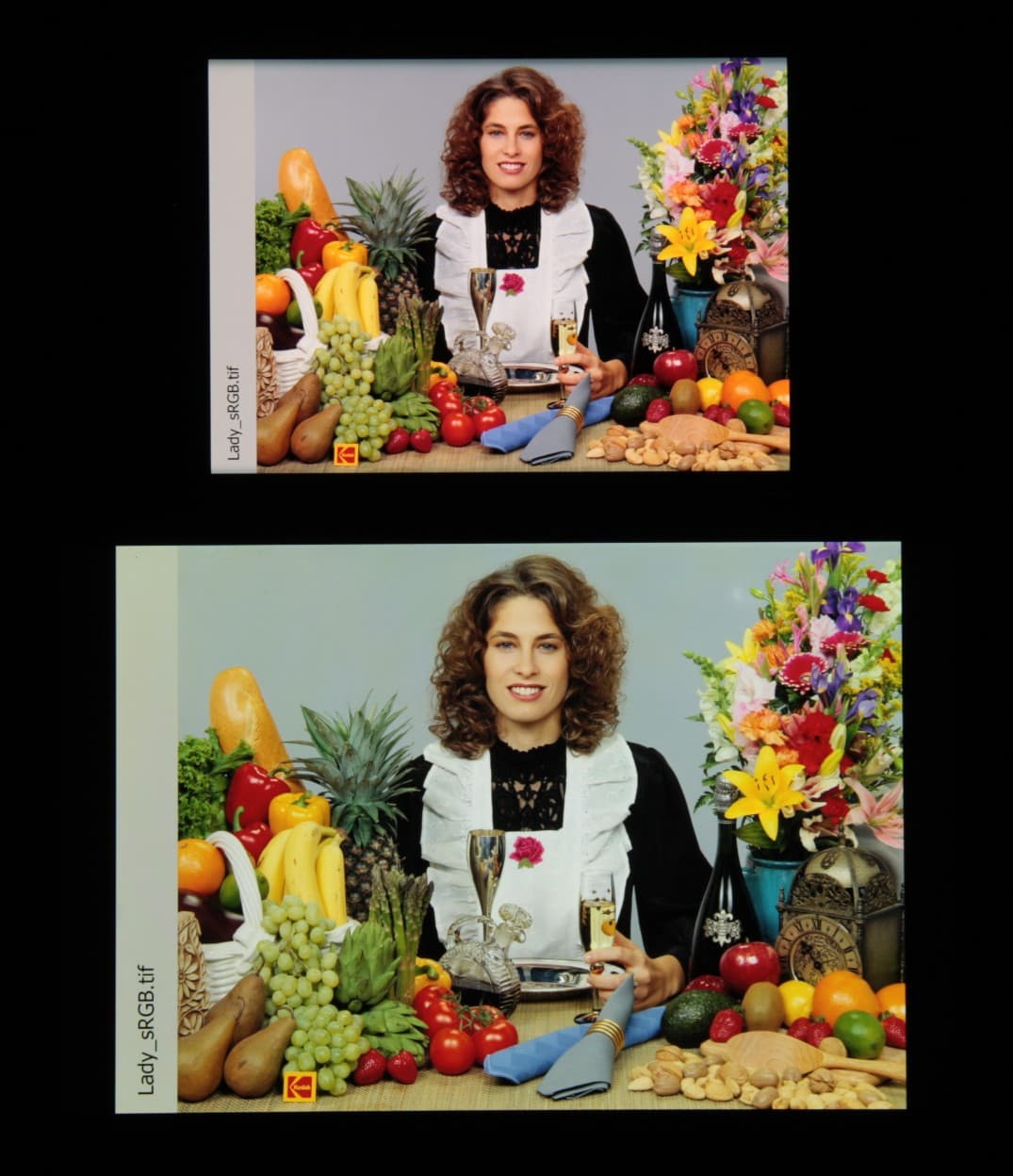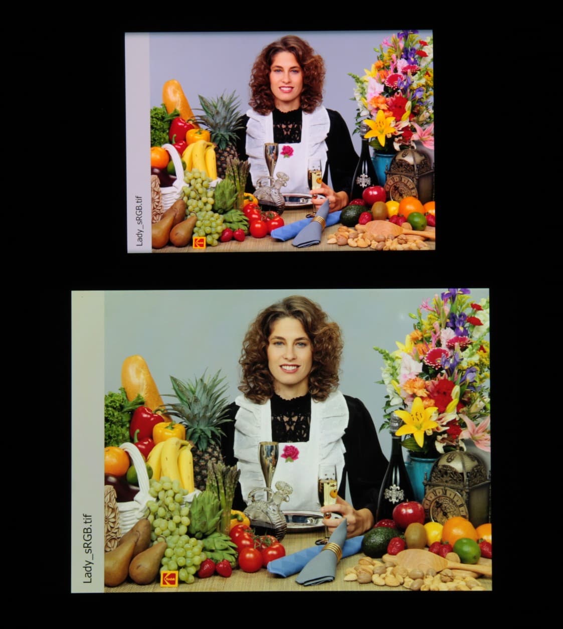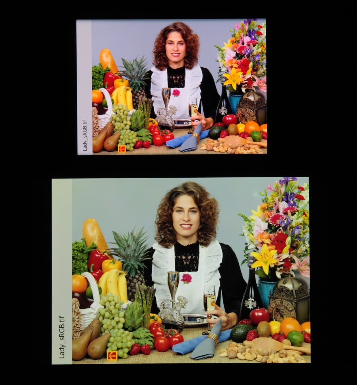 Цвета на экране смартфона перенасыщены (обратите внимание на помидоры, бананы, салфетку и оттенок лица), а цветовой баланс заметно отличается. Напомним, что фотография не может служить надежным источником сведений о качестве цветопередачи и приводится только для условной наглядной иллюстрации. В частности, выраженный красноватый оттенок белого и серого полей, присутствующий на фотографиях экрана смартфона, при перпендикулярном взгляде визуально отсутствует, что подтверждается аппаратными тестами с помощью спектрофотометра. Причина в том, что спектральная чувствительность матрицы фотоаппарата неточно совпадает с этой характеристикой человеческого зрения. Заметим, что в данном случае картинка занимает в высоту (при ландшафтной ориентации экрана) всю доступную для вывода изображения область и заходит на загнутые края экрана, что приводит к легкому затемнению и искажению цвета. Также на свету эти области почти всегда бликуют, что еще больше мешает при просмотре изображений, выведенных на весь экран. И даже картинка фильмов с соотношением сторон 16:9 заходит на загибы, что мешает при просмотре кино.