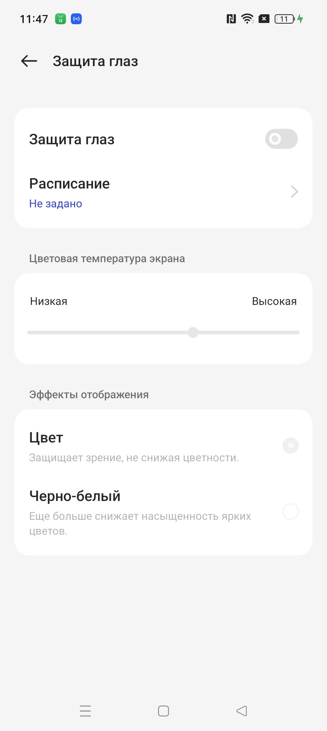 В этом устройстве есть возможность скорректировать цветовой баланс с помощью регулировки оттенка холодный—теплый. Но особого смысла это делать нет, достаточно выбрать профиль Естественный. Также в настройках можно уменьшить интенсивность синей компоненты.