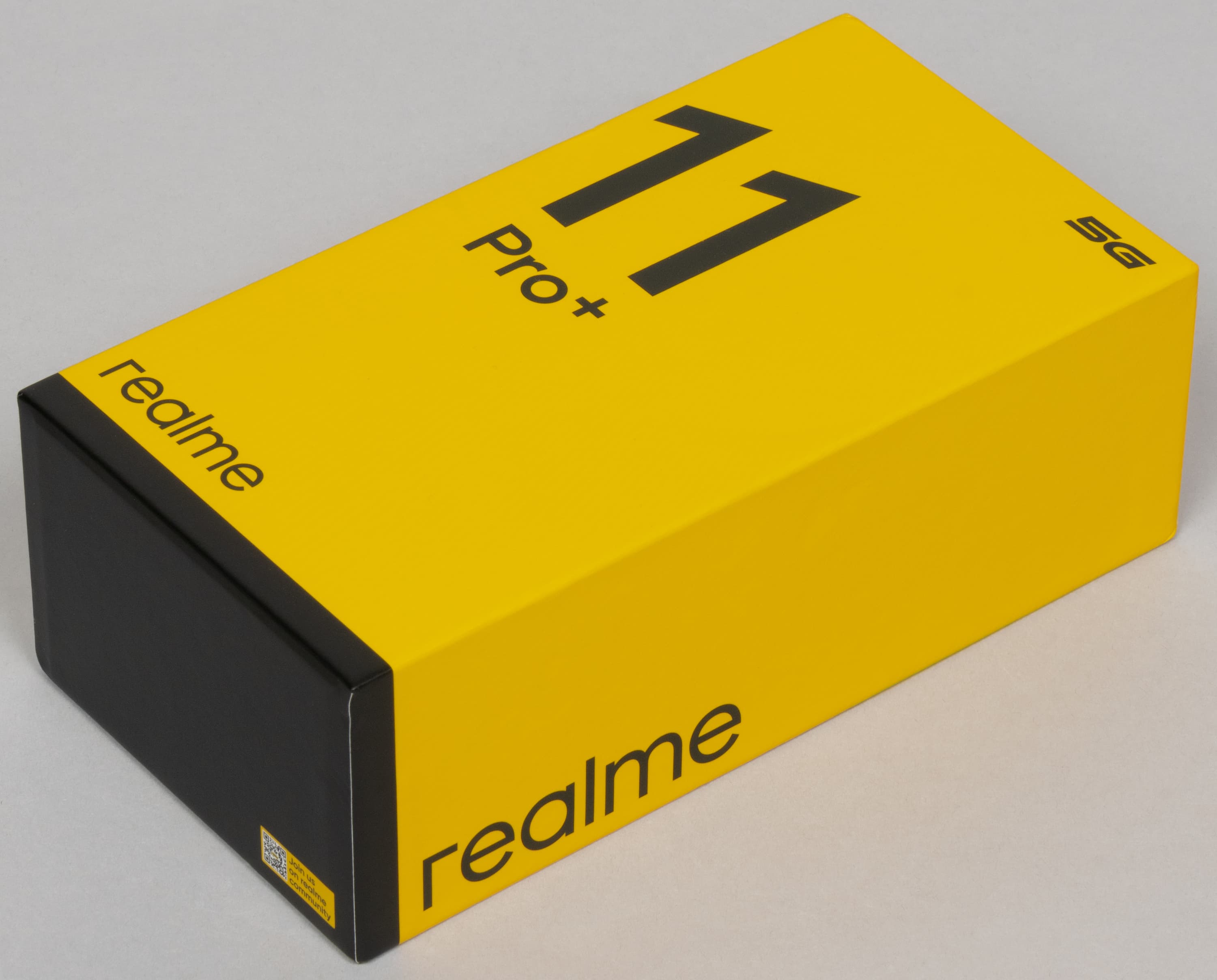 Смартфон Realme 11 Pro+ поставляется в твердой упаковке, оформленной в фирменных желто-черных цветах.