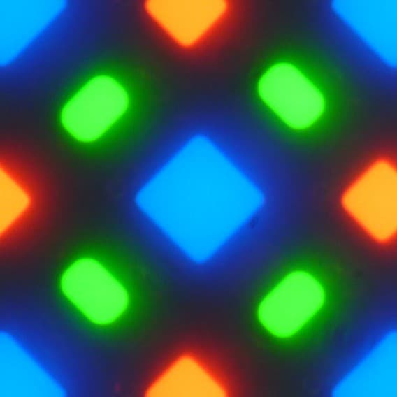 В этом экране используется матрица Super AMOLED — активная матрица на органических светодиодах. Полноцветное изображение создается с помощью субпикселей трех цветов — красного (R), зеленого (G) и синего (B), но красных и синих субпикселей в два раза меньше, что можно обозначить как RGBG. Это подтверждается фрагментом микрофотографии: