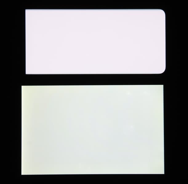 Экран характеризуется великолепными углами обзора. Правда, белый цвет при отклонении на большие углы приобретает едва заметный сине-зеленый оттенок. Черный цвет остается просто черным под любыми углами. Он настолько черный, что параметр контрастности в данном случае неприменим. Для сравнения приведем фотографии, на которых на экраны смартфона и второго участника сравнения выведены одинаковые изображения, при этом яркость экранов изначально установлена примерно на 200 кд/м², а цветовой баланс на фотоаппарате принудительно переключен на 6500 К.
