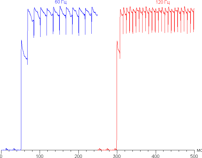 Переключение состояния элементов матрицы выполняется практически мгновенно, но на фронте включения может присутствовать ступенька шириной примерно 17 мс (что соответствует частоте обновления экрана примерно в 60 Гц) или примерно 8 мс (120 Гц). Например, так выглядит зависимость яркости от времени при переходе от черного к белому (режим 60 Гц и 120 Гц):