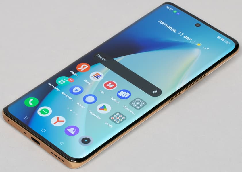 Realme 11 Pro+ выполнен в классическом флагманском дизайне последних лет — с обтекаемыми формами, без резких переходов между гранями и плоских поверхностей. Переднее и заднее стекла загнуты, боковая рамка заужена и закруглена. В руке смартфон лежит комфортно, но прокручивается, словно кусочек мыла, потому что боковины еще и скользкие.