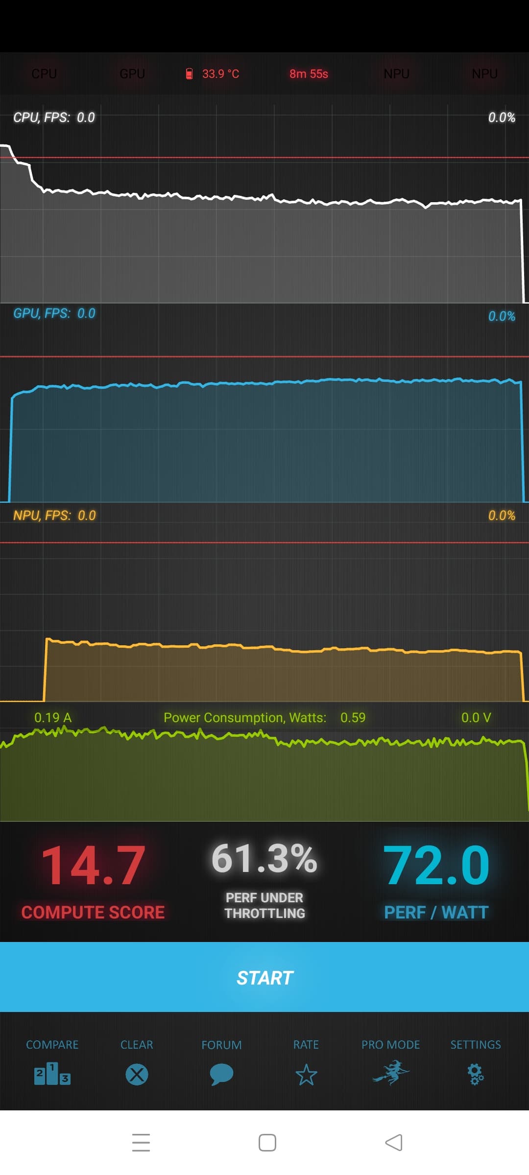 Тест на снижение производительности при нагреве мы проводим с помощью программы Burnout Benchmark, которая позволяет нагружать CPU, GPU и NPU: