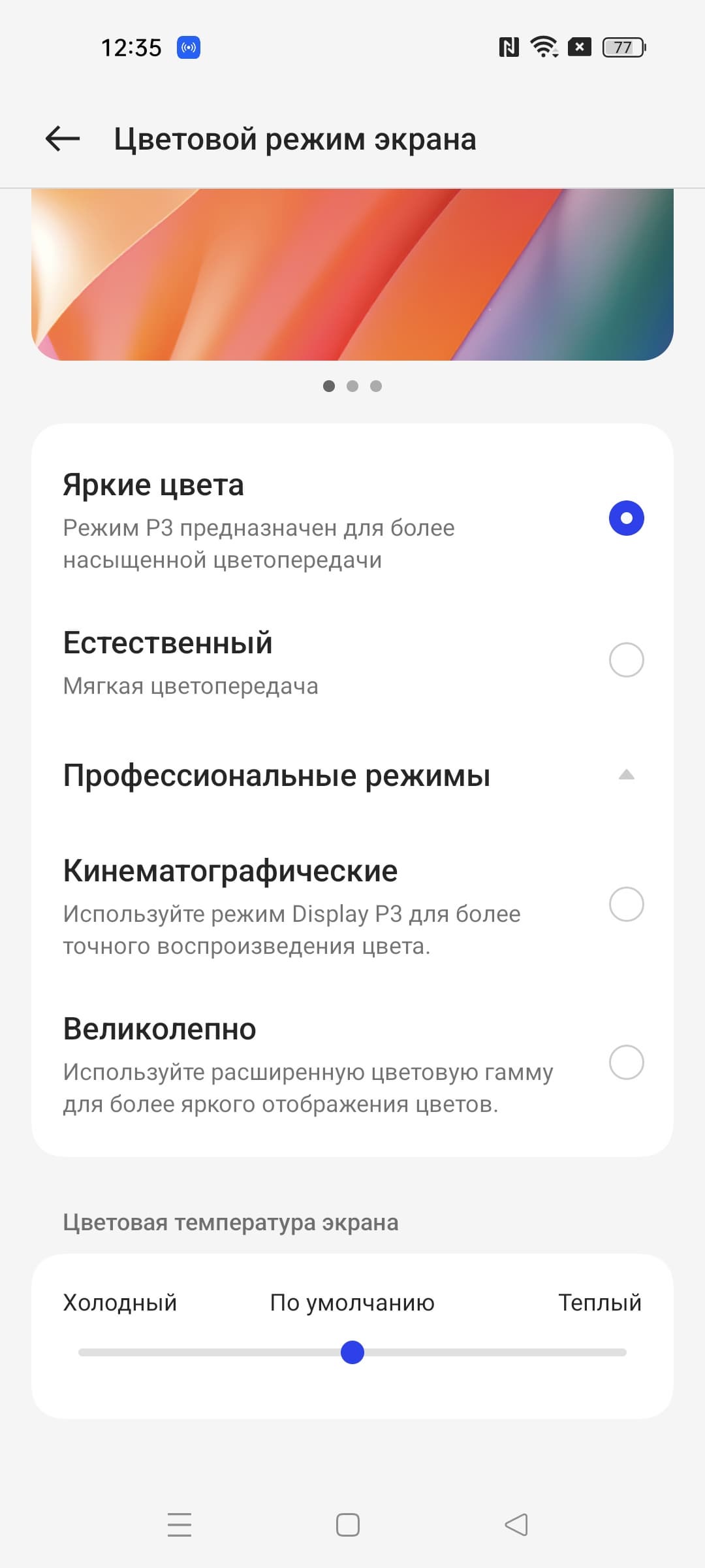 Фотография выше получена для профиля Яркие цвета в настройках экрана, который выбран по умолчанию. Профилей всего четыре:
