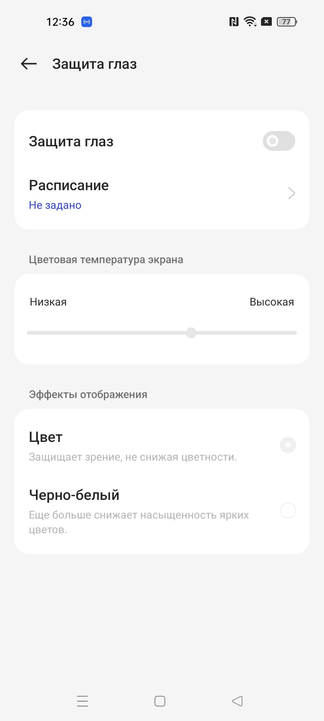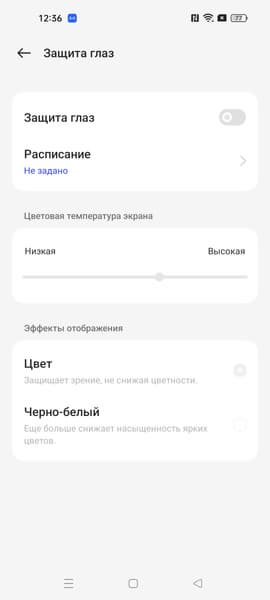 В этом устройстве есть возможность скорректировать цветовой баланс с помощью регулировки оттенка Холодный — Теплый. Но особого смысла это делать нет, достаточно выбрать профиль Естественный. Также в настройках можно уменьшить интенсивность синей компоненты.
