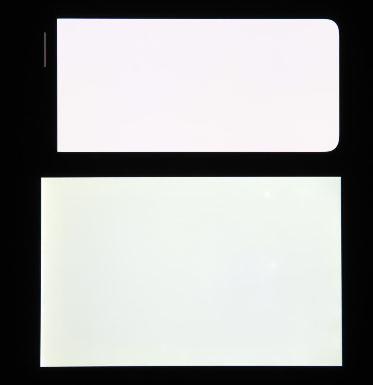 Экран характеризуется великолепными углами обзора. Правда, белый цвет при отклонении даже на небольшие углы приобретает легкие радужные оттенки, но черный цвет остается просто черным под любыми углами. Он настолько черный, что параметр контрастности в данном случае просто неприменим. Для сравнения приведем фотографии, на которых на экраны смартфона и второго участника (Nexus 7; снизу — Nexus 7, сверху — смартфон, далее их можно различать по размеру) выведены одинаковые изображения, при этом яркость экранов изначально установлена примерно на 200 кд/м², а цветовой баланс на фотоаппарате принудительно переключен на 6500 К.