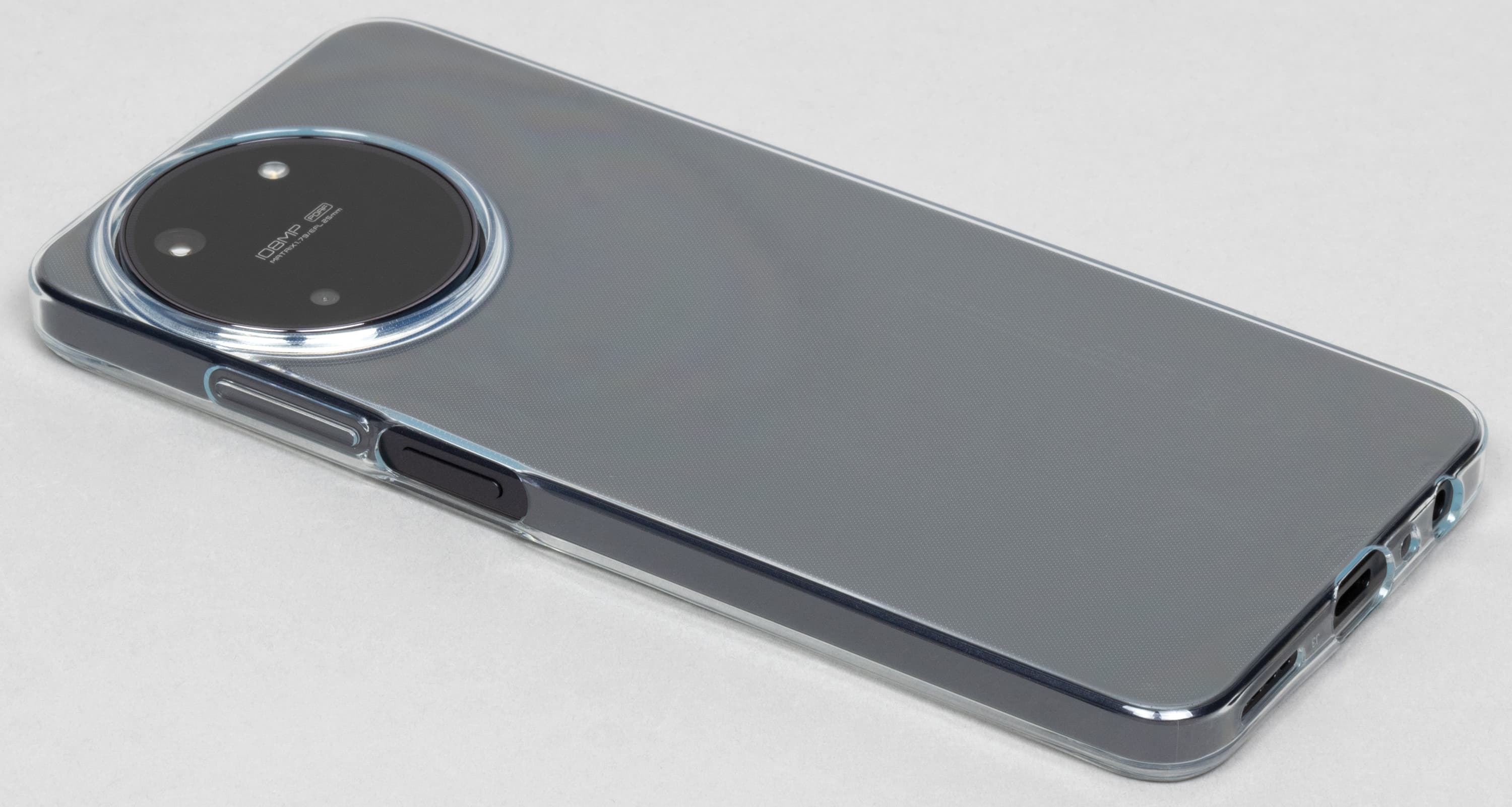 Комплектный прозрачный силиконовый чехол — толстый и надежный, он прикрывает выступами все особо уязвимые места смартфона (камеры, разъемы). К тому же, он немного нивелирует высоту выступающего блока с камерами, поэтому смартфон в чехле лежит на столе более устойчиво.