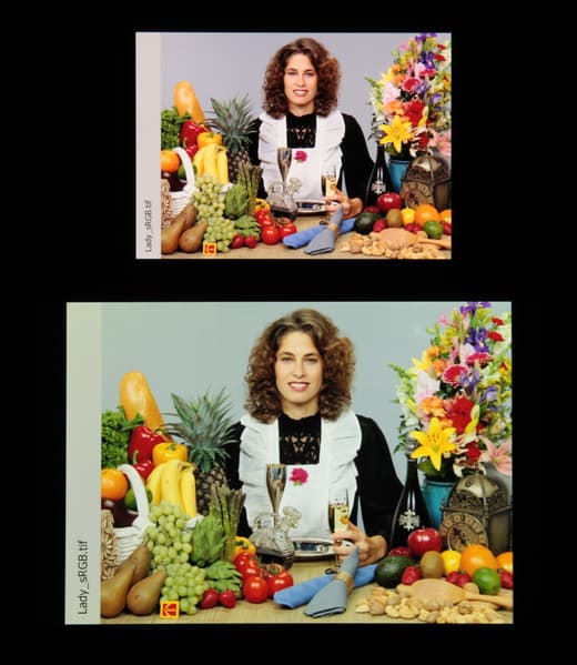 Цвета на экране смартфона перенасыщены (обратите внимание на помидоры, бананы, салфетку и оттенок лица), а цветовой баланс заметно отличается. Напомним, что фотография не может служить надежным источником сведений о качестве цветопередачи и приводится только для условной наглядной иллюстрации. В частности, выраженный красноватый оттенок белого и серого полей, присутствующий на фотографиях экрана смартфона, при перпендикулярном взгляде визуально отсутствует, что подтверждается аппаратными тестами с помощью спектрофотометра. Причина в том, что спектральная чувствительность матрицы фотоаппарата неточно совпадает с этой характеристикой человеческого зрения.